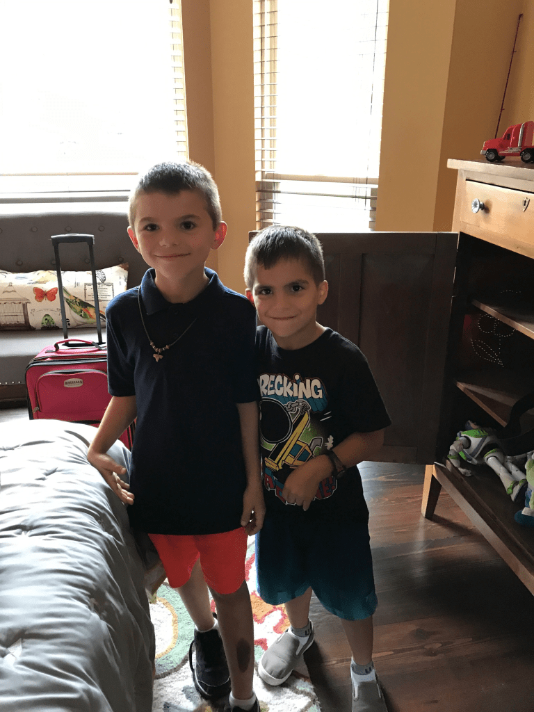 Will Cassady, left, and Ty Cassady, right, on the day they moved in with Wendy and Richard Cassady to begin fostering. Springdale, Ark. August 2017. Photo courtesy of Wendy Cassady.